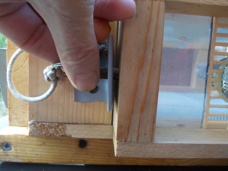 Pour nettoyer le piège, l'apiculteur doit ouvrir le piège, il sort les cales en bois qui sont situées sur le côté droit et gauche du clapet d'ouverture.