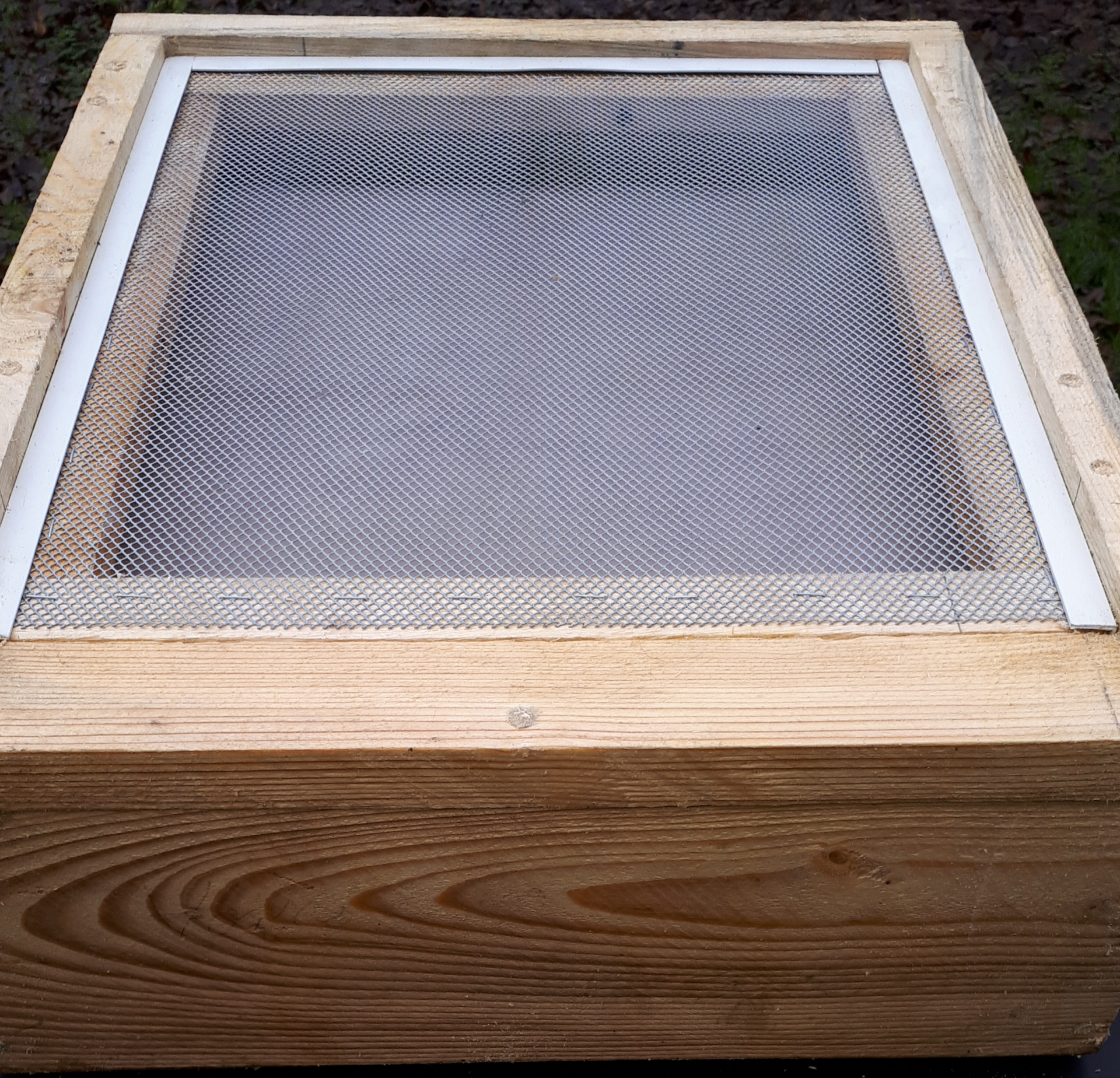 Sur la photo, on voit, en bas le fond de ruche, et protégé par un grillage antisouris de cinq millimètres